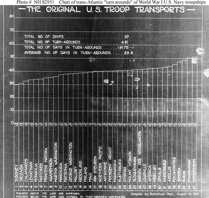 Photo #: NH 82951 "The Original U.S. Troop Transports" Chart compiled 16 August 1919, showing the number of trans-Atlantic "turn arounds" and their average duration for thirty seven U.S. Navy troop transports employed during and immediately after World War I. Collection of the USS Pocahontas Reunion Association, 1974. U.S. Naval History and Heritage Command Photograph. Online Image: 157KB; 690 x 655 pixels Click here to rotate chart 90 degrees clockwise |