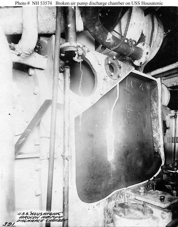 Photo #: NH 53574 USS Housatonic (ID # 1697) Broken air pump discharge chamber on the ship, circa 1918. U.S. Naval History and Heritage Command Photograph. Online Image: 101KB; 600 x 765 pixels |