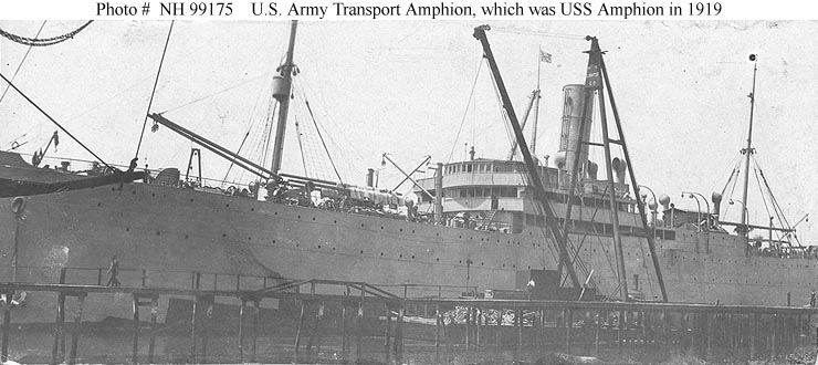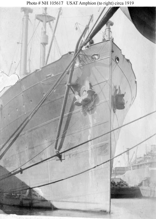 The ship was turned over to the Navy in 1919 and, in April of that year, was placed in commission as USS Amphion (ID # 1888). During the next five months she made three round-trip voyages to France as part of the vast effort to bring home American service personnel. Amphion was decommissioned in September 1919 and transferred to the U.S. Shipping Board. She was sold for scrapping in 1924.