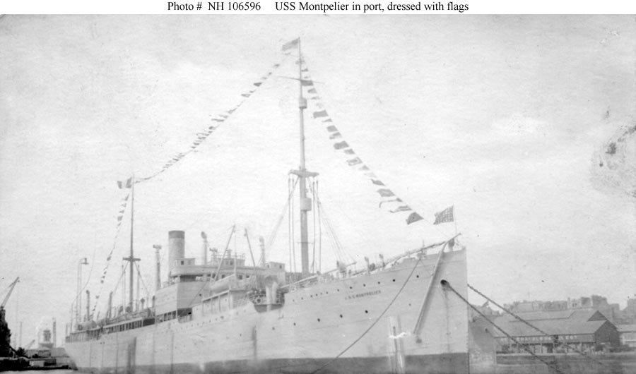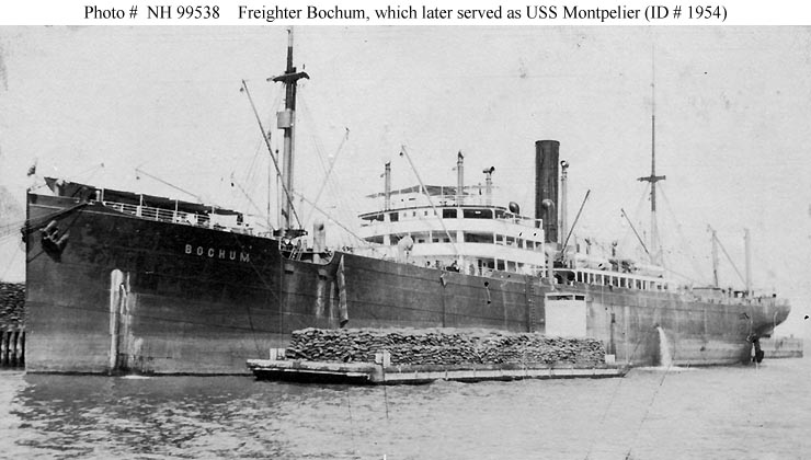 USS Montpelier, a 16,000-ton (displacement) transport, was built at Rostock, Germany, in 1912 as a 6161 gross ton German commercial freighter. She was seized by the U.S. Government in 1917 under the name Bochum. Later renamed Montpelier, she operated under charter to the Army during World War I. In March 1919 she began conversion to a transport and, when this work was completed, entered commissioned service as USS Montpelier (ID # 1954). The ship was decommissioned and returned to the U.S. Shipping Board in October 1919.