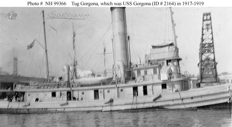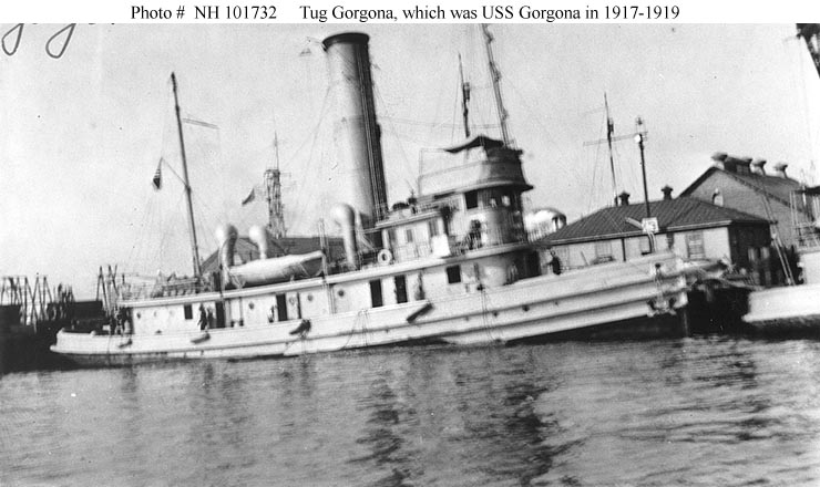 USS Gorgona, a 351 gross ton tug, was built at Staten Island, New York, in 1915 as the Panama Canal tug of the same name. She was taken over for Naval service during the first months of U.S. participation in World War I and placed in commission in July 1917. She operated out of Norfolk, Virginia, for the rest of the war, towing target rafts for Atlantic Fleet gunnery practice. In early 1919 Gorgona performed the same service out of Guantanamo Bay, Cuba. She went back to Panama in June 1919 and, after decommissioning, was returned to the Panama Canal Commission.
