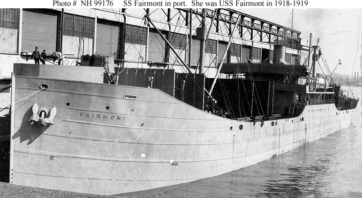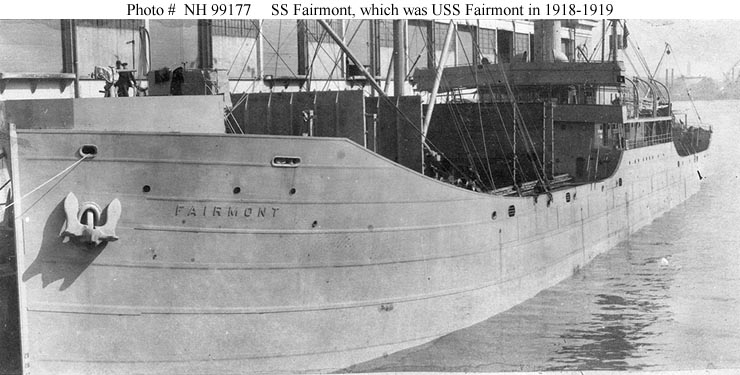 USS Fairmont, a 5400 gross ton cargo ship, was built at Camden, New Jersey, in 1917-1918 as the civilian collier of the same name. She was taken over by the Navy upon completion and placed in commission in February 1918. Fairmont was employed transporting equipment and supplies between the United States and France, making four trans-Atlantic round trip voyages for this purpose from March to November 1918, when the Armistice brought World War I's fighting to an end. She also made a post-war trip in December 1918 and January 1919, taking food and coal to Rotterdam, Holland. USS Fairmont was decommissioned in February 1919 and returned to her owner. While in commercial service in 1922, she was renamed Nebraskan.