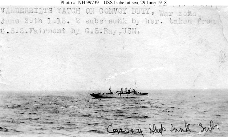 This "destroyer" (note torpedo tubes amidships), converted from a fast yacht, had received wartime credit for destroying at least one German submarine, though the U-Boat appears to have actually escaped. Isabel was built for Toledo, Ohio, automobile manufacturer John North Willys, not for a member of the Vanderbilt family.