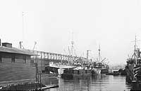 Photo #: NH 329 USS Rijndam (ID # 2505) At the New York Navy Yard after being painted in "dazzle" type camouflage, 1918. The barge Arthur (probably a different barge than the U.S. Navy's Arthur, ID # 1730) is alongside her bow, and the barge Henrietta Long is second outboard on the starboard side of the transport at right. Note: The subject of this photo has long been identified as USS Rijnland (ID # 2718), which was a a freighter, not a transport. The ship seen closely resembles Rijndam, and is almost certainly her. U.S. Naval History and Heritage Command Photograph. Online Image: 67KB; 740 x 505 pixels |