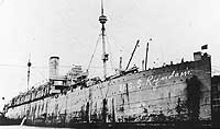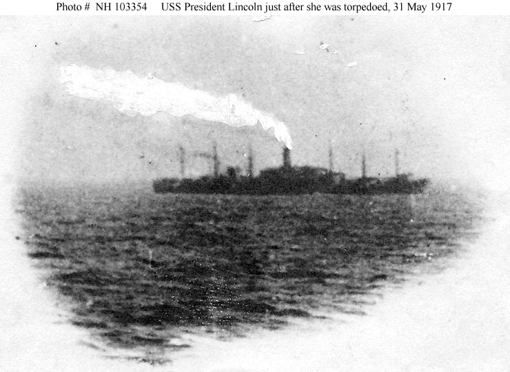 Note: Photo # NH 103354, a retouched photograph of USS President Lincoln just after she was torpedoed on 31 May 1918, was taken by USS Rijndam's radio operator.