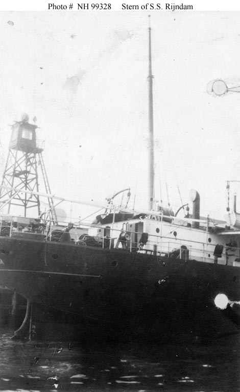 Photo #: NH 99328 S.S. Rijndam (Dutch Passenger Liner, 1901) Photograph of the ship's starboard stern area, taken prior to her World War I Naval service, possibly when she was inspected by the Third Naval District in the New York area on 23 March 1918. This ship was placed in commission as USS Rijndam (ID # 2505) on 1 May 1918 and returned to her owner on 22 October 1919. U.S. Naval History and Heritage Command Photograph. Online Image: 47KB; 470 x 765 pixels |