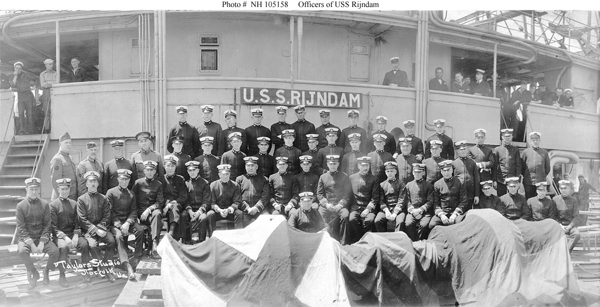 Photo #: NH 105158 USS Rijndam (ID # 2505) Ship's Officers posed on board, 1919. Photographed by Taylors Studio, Norfolk, Virginia. Donation of Dr. Mark Kulikowski, 2007. U.S. Naval History and Heritage Command Photograph. Online Image size: 159KB; 1200 x 615 pixels |