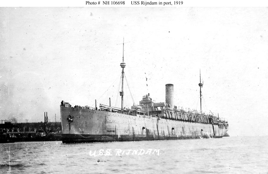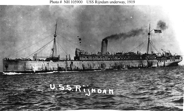 Photo #: NH 83195 USS Rijndam (ID # 2505) Off New York City, circa 1919. Photographed by E. Muller, Jr. Collection of Captain Glenn Howell, 1974. U.S. Naval History and Heritage Command Photograph. Online Image: 94KB; 740 x 465 pixels |