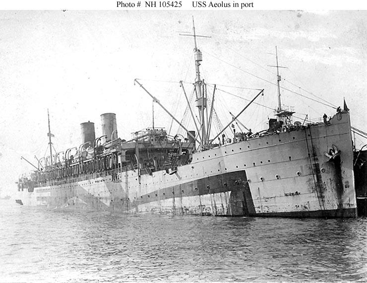 Photo #: NH 90626 USS Aeolus (ID # 3005) Photographed circa mid- or late 1918, after her "dazzle" camouflage had weathered considerably. Courtesy of Raymond O. Draves, 1980. U.S. Naval History and Heritage Command Photograph. Online Image: 102KB; 740 x 525 pixels |