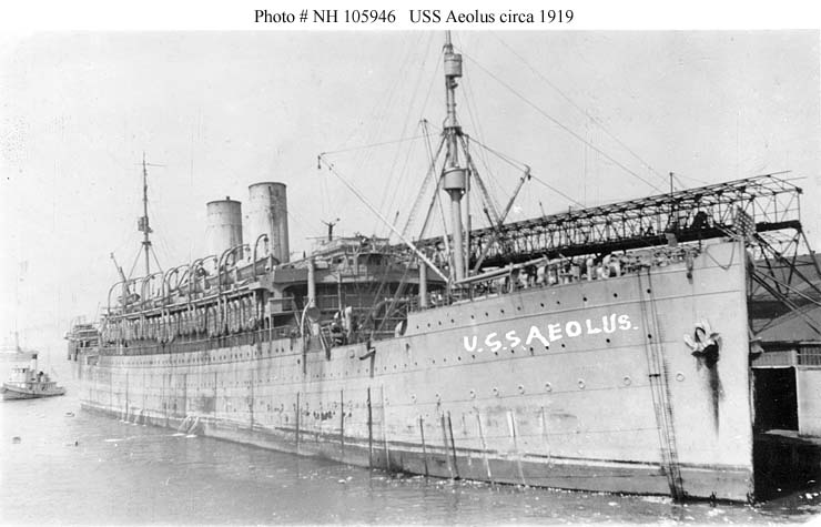 Photo #: NH 106389 USS Aeolus (ID # 3005) Photographed in 1919 The original image is printed on post card ("AZO") stock. Donation of Charles R. Haberlein Jr., 2008. U.S. Naval History and Heritage Command Photograph. Online Image: 62KB; 740 x 475 pixels |