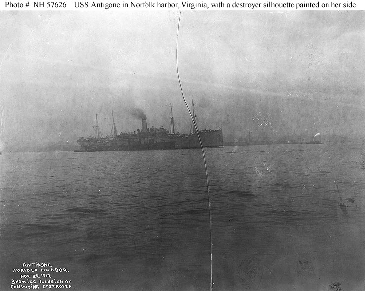 Photo #: NH 57626 USS Antigone (ID # 3007) In the Norfolk harbor, Virginia, on 29 November 1917. A destroyer silhouette is painted on her side to give the illusion that she is being closely convoyed. Donation of Mr. Marshall Butt, Norfolk Naval Shipyard Museum. U.S. Naval History and Heritage Command Photograph. Online Image: 77KB; 740 x 590 pixels |
