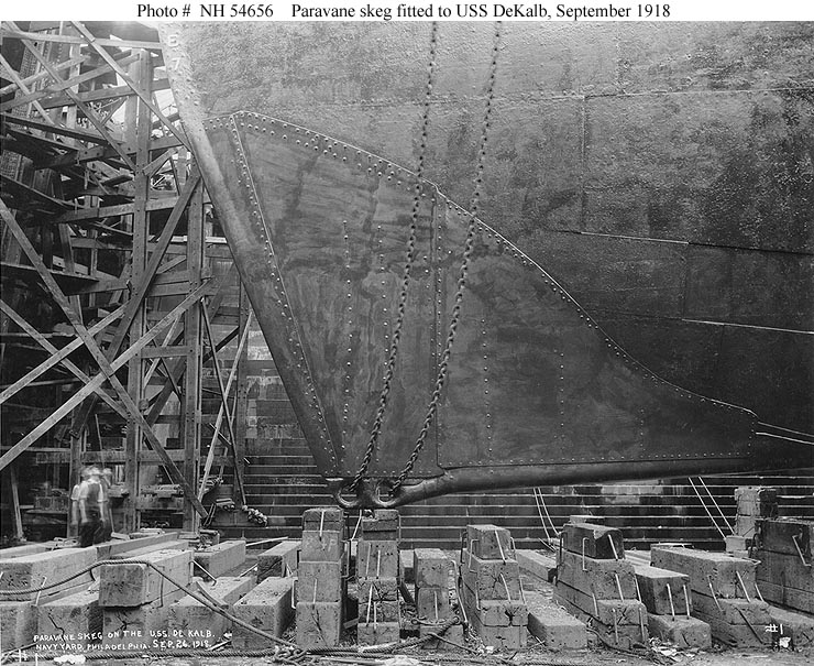 Photo #: NH 54656 USS DeKalb (ID # 3010) Paravane skeg fitted to the ship's forefoot, photographed in drydock at the Philadelphia Navy Yard, Pennsylvania, 26 September 1918. U.S. Naval Historical Center Photograph. Online Image: 154KB; 740 x 605 pixels |