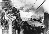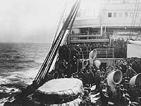 Photographed from Mercury's after port superstructure. Note the troops, most wearing life jackets, on her decks.
