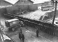 Ship's first liberty party is inspected by her Executive Officer, Commander Prentiss P. Bassett, at St. Nazaire, France. They were leaving the ship after the completion of her first trans-Atlantic trooping voyage, circa January 1918.