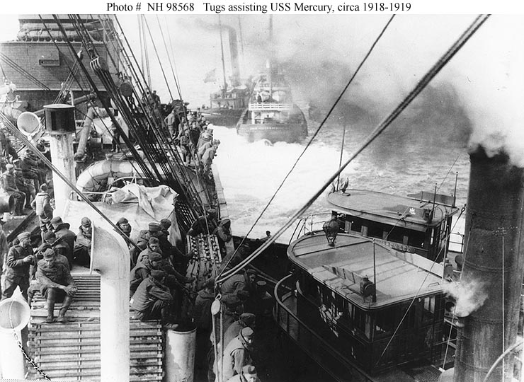 Photo # NH 98569:  Troops and Sailors crowd USS Mercury's superstructure, circa late 1918 or 1919