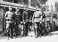 U.S. Army officers on board, posing with with a Navy Commander, probably during one of the ship's trans-Atlantic voyages returning troops to the U.S. from France, circa 1919.