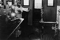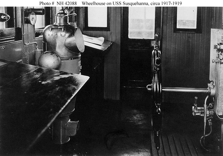 View in the ship's wheelhouse, showing binnacle, steering apparatus