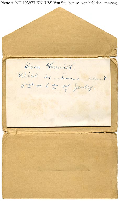 Photo #: NH 103973-KN (color) USS Von Steuben (ID # 3017) Message in a "Souvenir Folder", published circa 1918-1919, that features ten halftone reproductions of photographs of and on board the ship. Postmarked on 25 June 1919, it was sent by Private William Schenck, Co.A, 339th Infantry, to Mr. Fred Hagermann of Niles, Michigan. See Photo # NH 103963-KN for a view of the exterior cover of this "Souvenir Folder", with a listing of the photographs it contains. Donation of Dr. Mark Kulikowski, 2006. U.S. Naval Historical Center Photograph. Online Image: 50KB; 455 x 765 pixels |