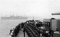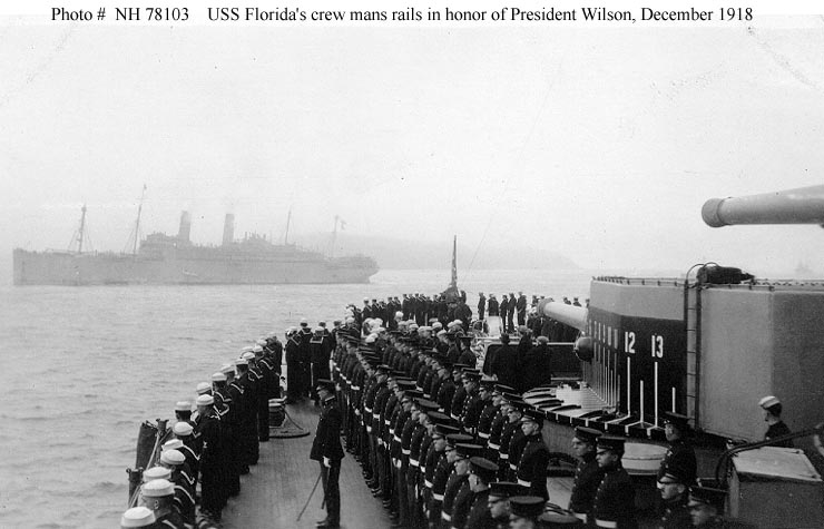 Ship's crew manning the rail as USS George Washington (in background) enters Brest harbor, France, with President Woodrow Wilson on board, 13 December 1918.
