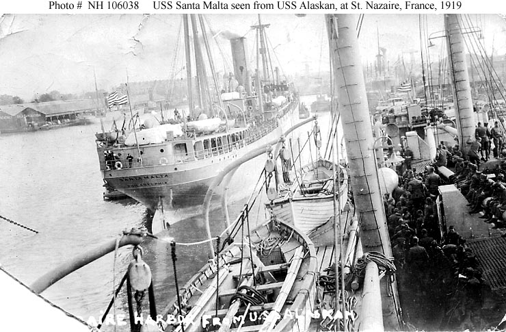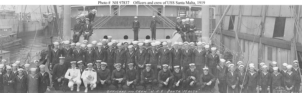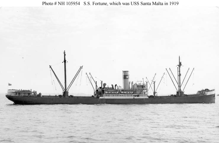 USS Santa Malta, a 6421 gross ton troop transport and cargo ship, was built at Philadelphia, Pennsylvania, in 1918-19 for civilian owners. She was taken over by the U.S. Shipping Board upon completion and transferred to the Navy, which placed her in commission in May 1919. Between then and August 1919, she made three voyages to and from France, bringing U.S. service personnel home after World War I service. Subsequently, the ship carried cargo from New York City to Panama, calling at New Orleans while en route. USS Santa Malta was decommissioned in November 1919, soon after returning from Panama. Later returned to her owner by the Shipping Board, she entered merchant service. She was renamed Hawaiian in 1925, became the Panamanian registry (with an Italian owner) freighter Fortune in 1949, and was scrapped at Spezia, Italy in 1958.