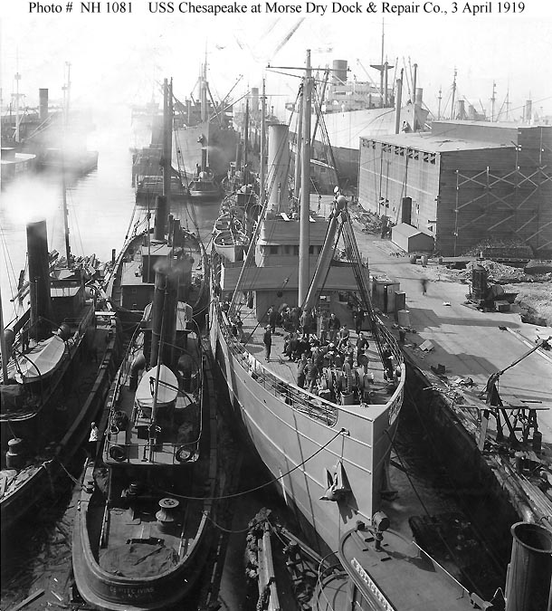 USS Chesapeake, a 2000-ton (displacement) salvage ship, was built at Wilmington, Delaware, in 1900 by Harlan & Hollingsworth as the 1101 gross ton civilian freighter Chesapeake. She was acquired by the Navy at the end of August 1918, converted at New York, and placed in commission in March 1919. In May Chesapeake crossed the Atlantic to France and spent the next few months performing salvage and other duties. Beginning in August she carried equipment to Scotland in support of the operation to sweep the North Sea mine barrage. Decommissioned at Brest, France, in late October 1919, Chesapeake was soon sold to a British salvage firm.