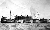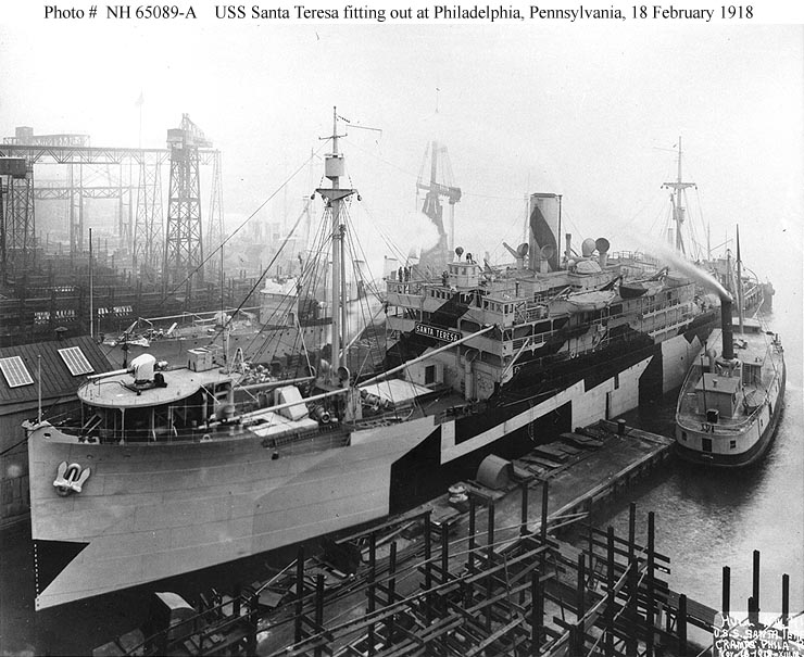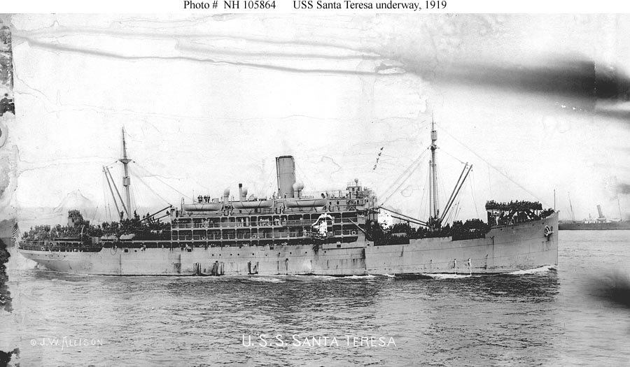 USS Santa Teresa, an 8890-ton transport, was built in 1918 at Philadelphia, Pennsylvania, as the civilian passenger liner of the same name. Taken over by the Navy for World War I use, she was commissioned in mid-November 1918, a week after the Armistice ended the fighting. Between December 1918 and September 1919 Santa Teresa made seven round-trip voyages between the United States and France, primarily bringing home war veterans. The ship was decommissioned in October 1919 and turned over to the U.S. Shipping Board for return to her owners. During the next two decades she operated commercially as SS Santa Teresa and, after 1936, as SS Kent.