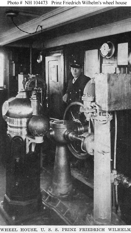 Halftone reproduction of a photograph taken in the ship's wheel house. It was published in 1919 by A.M. Simon, 324 E. 23rd St., New York City, as one of ten images in a "Souvenir Folder" concerning USS Prinz Friedrich Wilhelm.