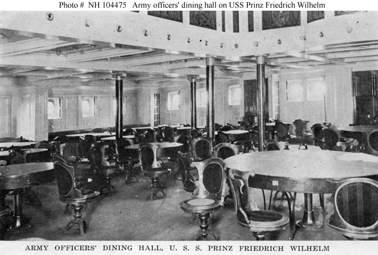 Halftone reproduction of a photograph taken in the Army officers' dining room on board the ship. It was published in 1919 by A.M. Simon, 324 E. 23rd St., New York City, as one of ten images in a "Souvenir Folder" concerning USS Prinz Friedrich Wilhelm.