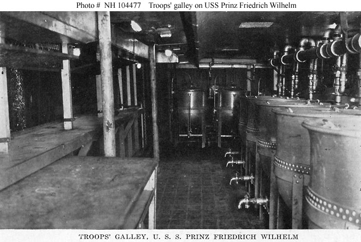 Halftone reproduction of a photograph taken in the troops' galley on board the ship. It was published in 1919 by A.M. Simon, 324 E. 23rd St., New York City, as one of ten images in a "Souvenir Folder" concerning USS Prinz Friedrich Wilhelm.