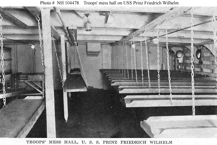 Halftone reproduction of a photograph taken in the troops' mess hall on board the ship, 1919. It was published in 1919 by A.M. Simon, 324 E. 23rd St., New York City, as one of ten images in a "Souvenir Folder" concerning USS Prinz Friedrich Wilhelm.