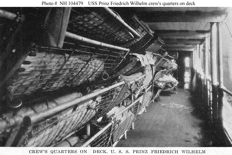 Halftone reproduction of a photograph showing crew's sleeping facilities on deck, 1919. It was published in 1919 by A.M. Simon, 324 E. 23rd St., New York City, as one of ten images in a "Souvenir Folder" concerning USS Prinz Friedrich Wilhelm.