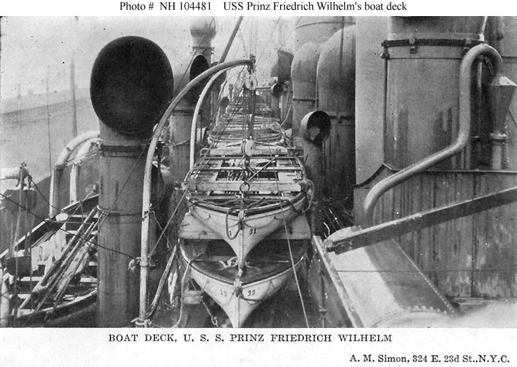 Halftone reproduction of a photograph of the ship's boat deck, 1919. It was published in 1919 by A.M. Simon, 324 E. 23rd St., New York City, as one of ten images in a "Souvenir Folder" concerning USS Prinz Friedrich Wilhelm.