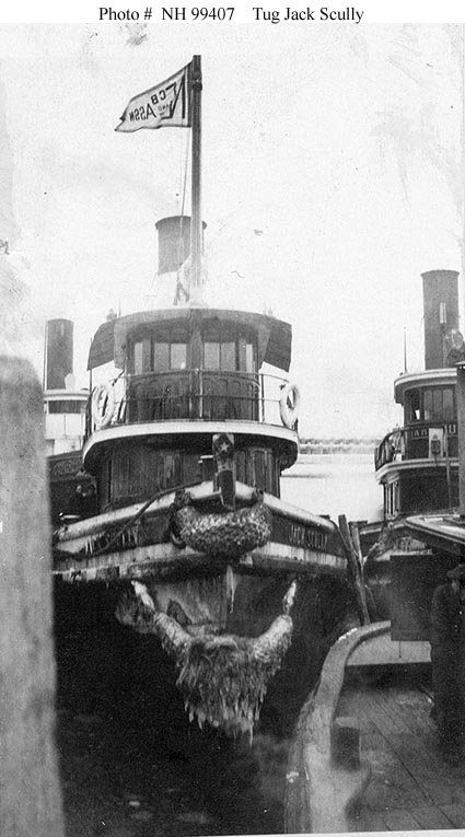 Photo #: NH 101983 Jack T. Scully (U.S. Harbor Tug, 1899) Photographed circa 1917, probably in the New York City area. This tug was taken over by the Navy on 25 September 1917, shortly after being renamed Mariner. Placed in commission on 19 December 1917 as USS Mariner (SP-1136), she was lost in a storm off Long Island, New York, on 26 February 1918. A Pennsylvania Railroad ferryboat is in the background. The original print is in National Archives' Record Group 19-LCM. U.S. Naval Historical Center Photograph. Online Image: 65KB; 740 x 525 pixels Note: This photograph was previously identified, incorrectly, as Jack Scully (ID-2289), a smaller tug built in 1891 that was formerly named H.M.C. Smith. |