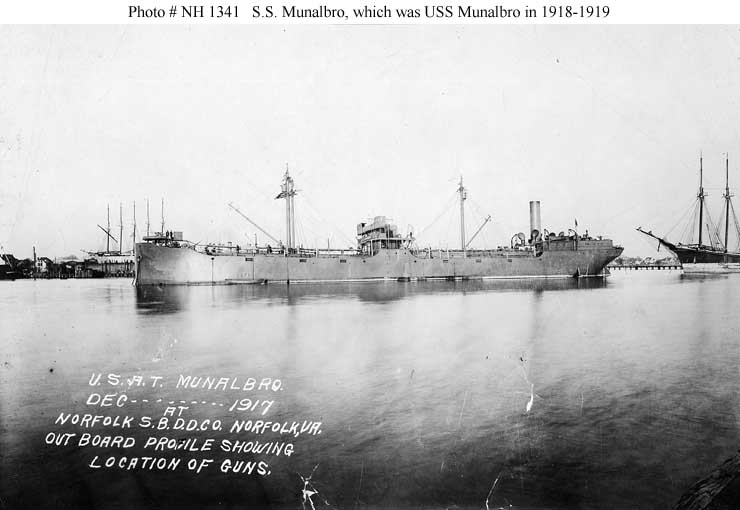 Munalbro, a 4293 gross ton (9220 tons displacement) collier, was built at Newport News, Virginia, in 1916. Her initial World War I service was performed under U.S. Army charter, but in September 1918 she was taken over by the Navy, placed in commission as USS Munalbro (no ID number was assigned) and employed as a freighter. After loading general Army cargo at Newport News, the ship joined a convoy at New York and proceeded to France, where she delivered her cargo at La Pallice, St. Nazaire, and Nantes during October 1918. Returning to Norfolk, Virginia, in November, Munalbro loaded a cargo of Army general supplies in December and delivered it to Quiberon, France, in January 1919. In February she brought Army cargo back from Nantes to New York. USS Munalbro was decommissioned in March 1919 and returned to the U.S. Shipping Board for simultaneous delivery to her owners, the Munson Steamship Company of New York. Her subsequent commercial service extended for three and a half decades. She was renamed James L. Richards in 1936 and scrapped in 1954.