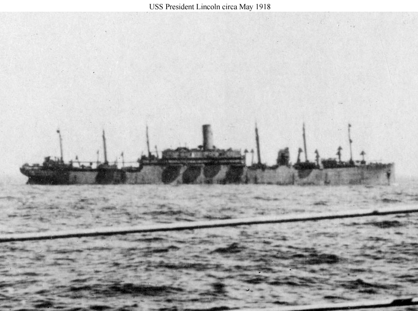 Photo #: None USS President Lincoln (1917-1918) Underway in pattern camouflage circa May 1918. This view is cropped from a larger view on a post card captioned "Pres. Lincoln on her last voyage." Source: Shipscribe. |