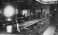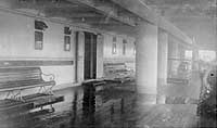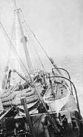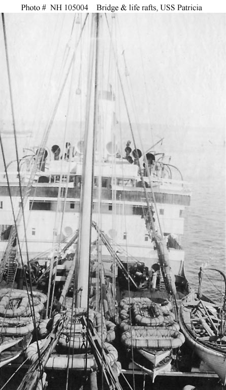 View looking forward from the ship's bridge, circa May-June 1919, with life boat and life raft stowage in the foreground.