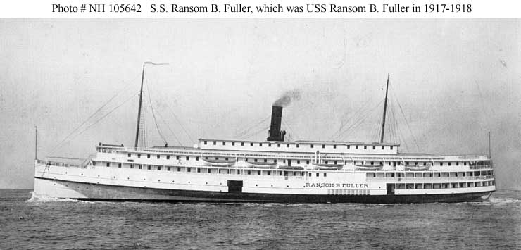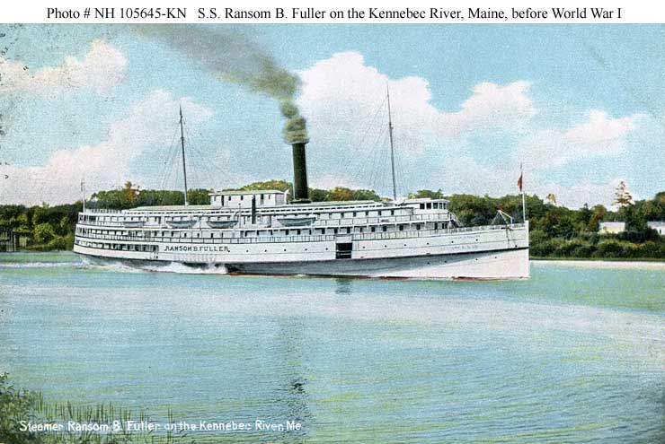 Ransom B. Fuller, a side-wheel steamer, was built at Bath, Maine in 1902. She was lengthened in 1910 for operations between Portland, Maine and Boston, Massachusetts. In November 1917 the Navy chartered the 2329-ton vessel for use as a floating barracks at New London, Connecticut. This brief service ended in April 1918, when she was returned to her owner, the Eastern Steamship Company. S.S. Ransom B. Fuller was reportedly scrapped in 1935.