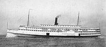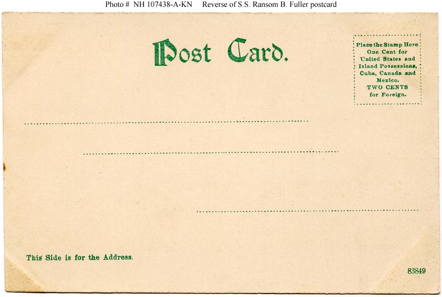 Photo #: NH 107438-KN (color) S.S. Ransom B. Fuller (American Coastal Passenger Steamship, 1902) Color postcard published in Germany for G.W. Morris, Portland, Maine, prior to World War I and showing the ship before lengthening. Ransom B. Fuller was briefly in U.S. Navy service as a barracks ship in 1917-1918. For an image of the reverse of this postcard, see: Photo # NH 107438-A-KN. Donation of George H. Petrin, 2010. U.S. Naval History and Heritage Command Photograph. Online Image: 118 KB; 900 x 605 pixels |