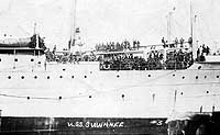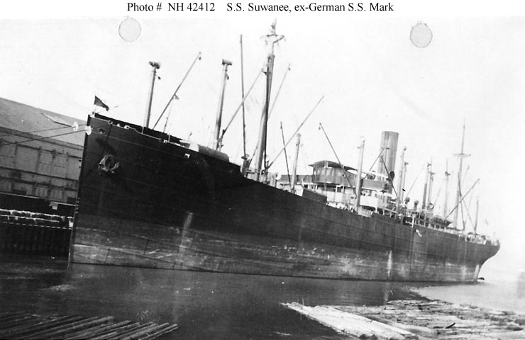 S.S. Mark, a 6579 gross ton freighter, was built at Vegesack, Germany, in 1913 for the North German Lloyd Lines. When World War I began in August 1914 she took refuge at Manila, Philippine Islands, and was seized by the U.S. Government when the U.S. entered the conflict in 1917. Renamed Suwanee, she operated for the remainder of the War as an American flag civilian freighter. In April 1919 the ship was taken over by the Navy and converted to a troop transport. She appears to have entered commissioned service later in that month, or in May, as USS Suwanee (ID # 1320) and was presumably employed thereafter bringing American war veterans home from Europe. She was placed out of commission early in October 1919 and returned to the U.S. Shipping Board. As some point during her subsequent commercial service, she was renamed Poznam.