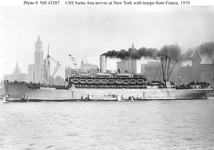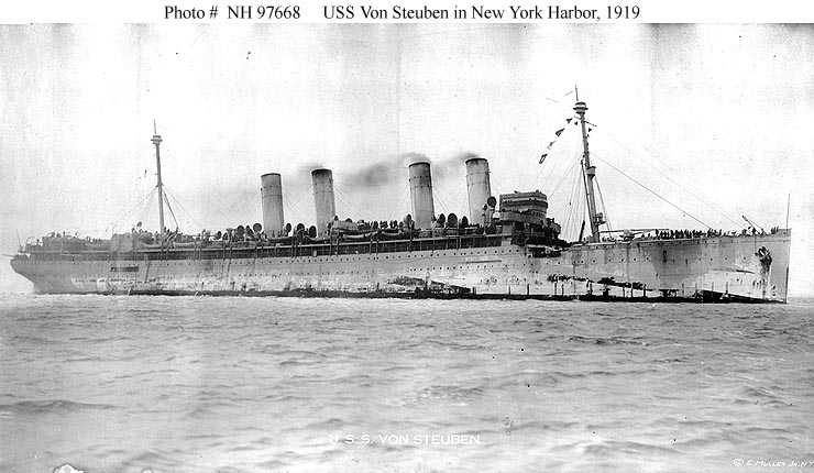 A Note on Sources: The basic listing of 125 commissioned U.S. Navy trans-Atlantic transports is taken from the 1919 Annual Report of the Secretary of the Navy, Appendix F. This extremely useful source provides statistics on the individual ships, the number of pre- and post-Armistice voyages made by each vessel, and the number of passengers transported. Tonnage (gross tons in the great majority of cases. Displacement tons for a few ships) and dimensions come from several sources. Primarily, dimensions and some tonnage data were taken from the 1918-1919 and 1919-1920 editions of Lloyds Register of Shipping. Tonnage data was also obtained from individual ship data cards. A modest amount of dimension data came from the Dictionary of American Naval Fighting Ships.