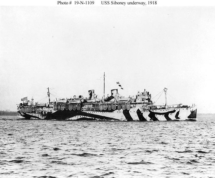 Caution: Not every ship bearing the characteristics shown on these pages was commissioned in the U.S. Navy. There were many World War I era ships, large and small, that were employed by the U.S. Government under commercial charter, or which operated under the flags of the United Kingdom, France, Italy and other nations. Many of these closely resemble ships that did serve in the U.S. Navy, and a large proportion wore pattern camouflage schemes very much like those carried by the Navy's ships. Approach any ship identification task with this firmly in mind.