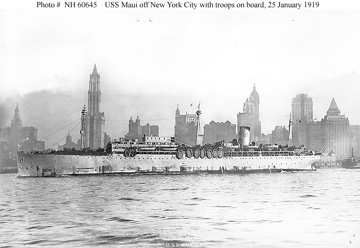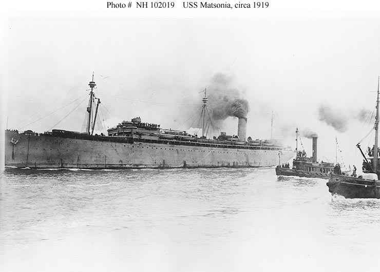 Three of the U.S. Navy's WWI era transports had three masts and one smokestack, with the latter located well aft of amidships. Owned by the Matson Line, they had operated in the Pacific prior to joining the Navy, and returned to that ocean after leaving Government service in 1919.