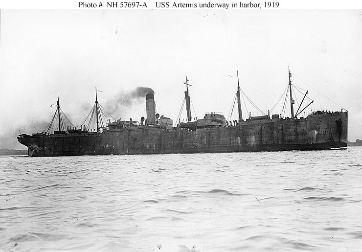Artemis, a much smaller ship, had five masts in addition to her smokestack. She was of similar configuration to the six-masters, possibly reflecting her origins at Belfast's Harland & Wolff shipyard, which constructed all three. Also a former German ship, she was a U.S. Army transport from mid-1917 through early 1919, then was transferred to the Navy. Though presented here on the basis of mast configuration and previous transport use, Artemis' relatively short midships superstructure makes her appear rather more like a large freighter than a passenger ship.