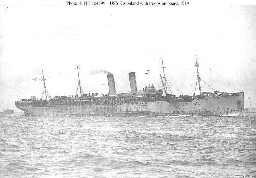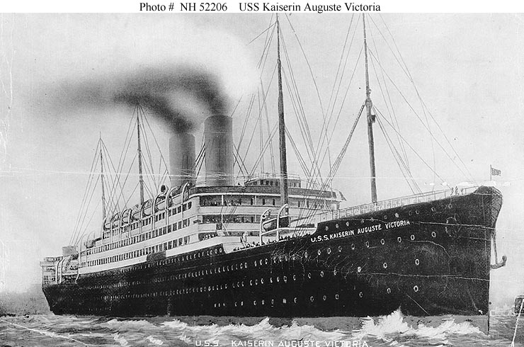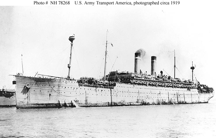 Seven WWI era U.S. Navy transports had two smokestacks and four masts. Five were taken into service during the war. Three of these were former German passenger liners seized in 1917 and commissioned later in that year. One of them was torpedoed and sunk during the conflict. Two U.S. flag liners were placed in commission in 1918, after initially operating with civilian crews under U.S. Army charter. The remaining two ships, which had spent the war in Germany, were taken over early in 1919 to convey U.S. service personnel home from Europe.