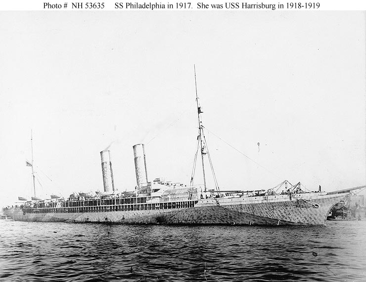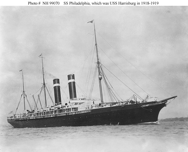 While westbound on 21 May 1899, Paris ran on the rocks in western Britain. Refloated after a major salvage effort, the badly damaged ship was rebuilt at Belfast, Ireland, receiving new engines and having her triple smokestacks replaced by a pair of taller ones. Renamed Philadelphia, she resumed North Atlantic passenger service. After the United States entered World War I in 1917 she was used as a transport, carrying U.S. troops to Europe. This important duty continued in 1918, when the U.S. Navy took her over and renamed her Harrisburg. Returned to her owners in September 1919 and again named Philadelphia, she once more was employed carrying passengers between America, Britain and France. By now very elderly and old-fashioned, in 1922 the ship was purchased by new owners, who planned to use her in the Mediterranean. However, financial problems stopped Philadelphia at Naples, Italy, where she remained until sold for scrapping in 1923.