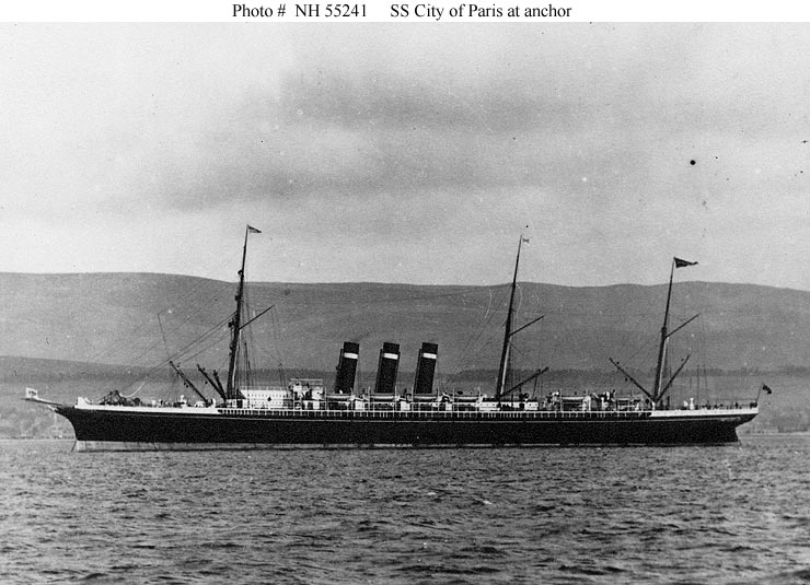 The steamship City of Paris, a 10,499 gross ton twin screw passenger liner, was built at Glasgow, Scotland. Completed in 1889, she soon began a series of record trans-Atlantic passages, earning the "Blue Ribband" for fast passenger service. She was transferred to the U.S. flag in 1893 and renamed Paris, but remained active on the passenger route between the U.S. and England. During the 1898 Spanish-American War she was under charter to the U.S. Navy, serving as USS Yale. Following the conflict she returned to commercial work as Paris.