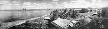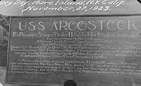 USS Aroostook (CM-3) is just offshore. beyond the palm