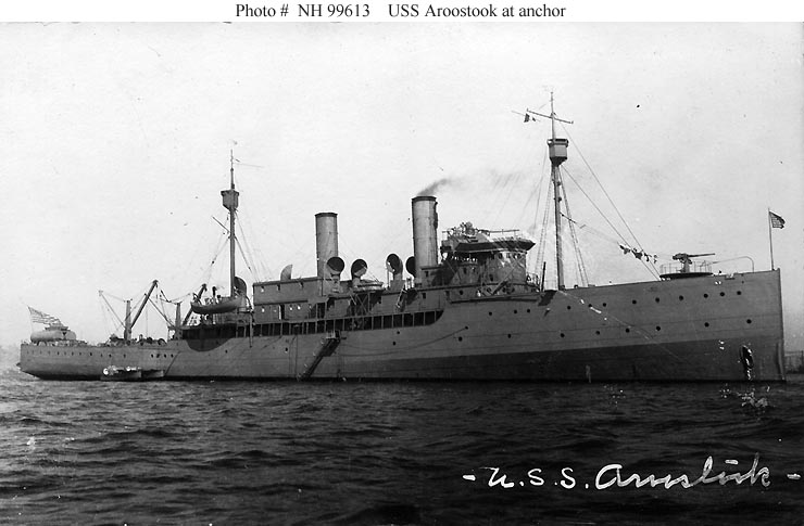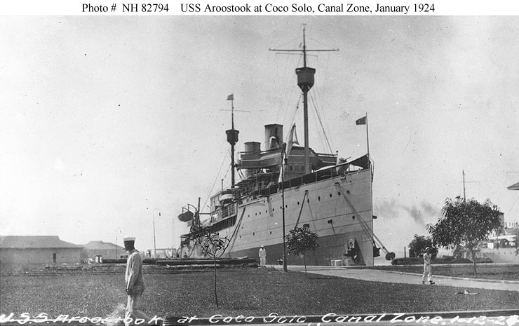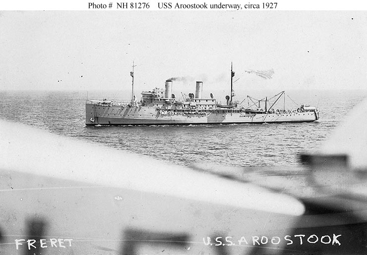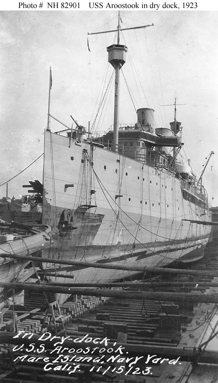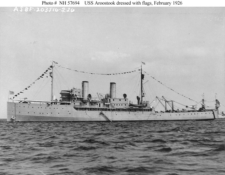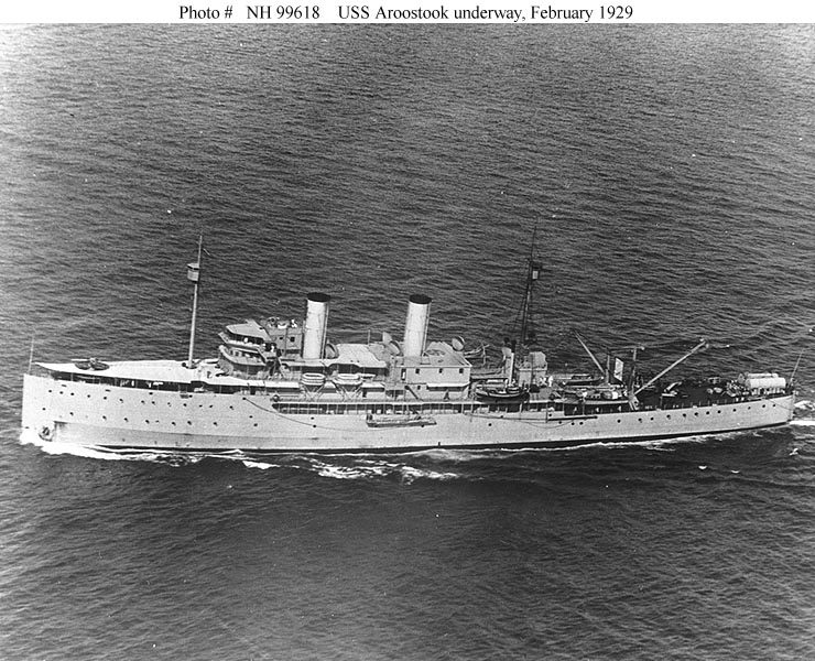 USS Aroostook (CM-3) alongside a pier at Naval Air Station San Diego, California, 12 October 1922. Port bow high aerial view. USS Aroostook (CM-3) off Oahu, Hawaii Territory, 27 April 1925. Taken from an aircraft based on USS Wright (AV-1). Starboard quarter low aerial view. The ship's extreme stern has been cropped out of the left side of this image. USS Aroostook (CM-3) on 28 February 1926, possibly off Honolulu, Hawaii. Port quarter aerial view, rather toward the broadside. The ship is seen distantly, only taking up about one-sixth of the width of the image. USS Aroostook (CM-3) at anchor in San Diego Harbor, California, on 4 August 1928. Starboard broadside aerial view, slightly toward the bow. As 80-G-466198, but port bow high aerial view.
