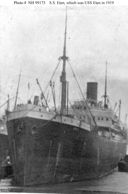 Rhakotis, a 6982 gross ton passenger steamship, was built at Hamburg, Germany, in 1907 and was taken over and renamed by the U.S. Shipping Board in 1917. She was acquired by the Navy from the Shipping Board at the beginning of May 1919 and placed in commission at that time as USS Eten (ID # 4041). Between late May and late July 1919 she was employed as a troop transport by the Cruiser and Transport Force, making two voyages to bring U.S. service personnel home from Europe. Decommissioned in mid-August 1919, Eten was then returned to the Shipping Board.