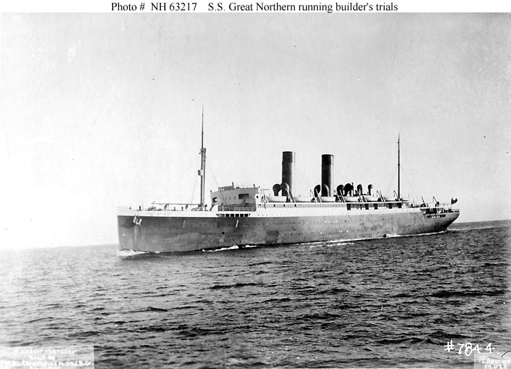 Photo #: NH 63217 S.S. Great Northern (American Passenger Liner, 1915) Running builder's trials, circa late 1914 or early 1915. This ship was constructed by the William Cramp & Sons shipyard, Philadelphia, Pennsylvania. She was USS Great Northern in 1917-1919. U.S. Naval Historical Center Photograph. Online Image: 77KB; 740 x 535 pixels |